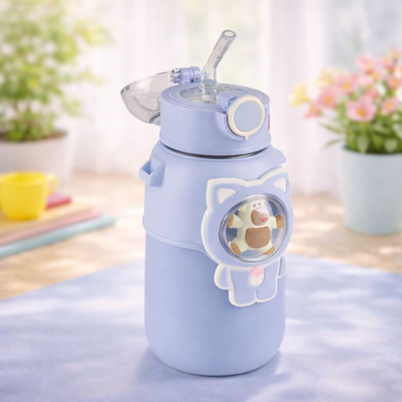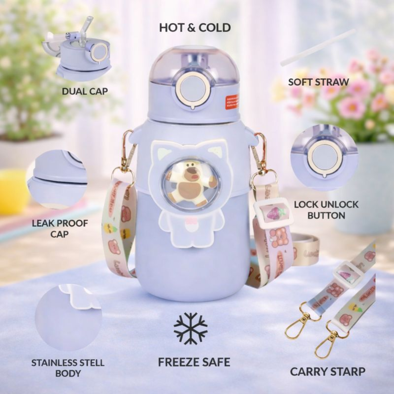 Hot & cold straw sipper water bottle in blue, suitable for kids and adults (12+ months). Ideal for milk, water, juice, and beverages, with a cartoon design and easy-carry strap for everyday use.