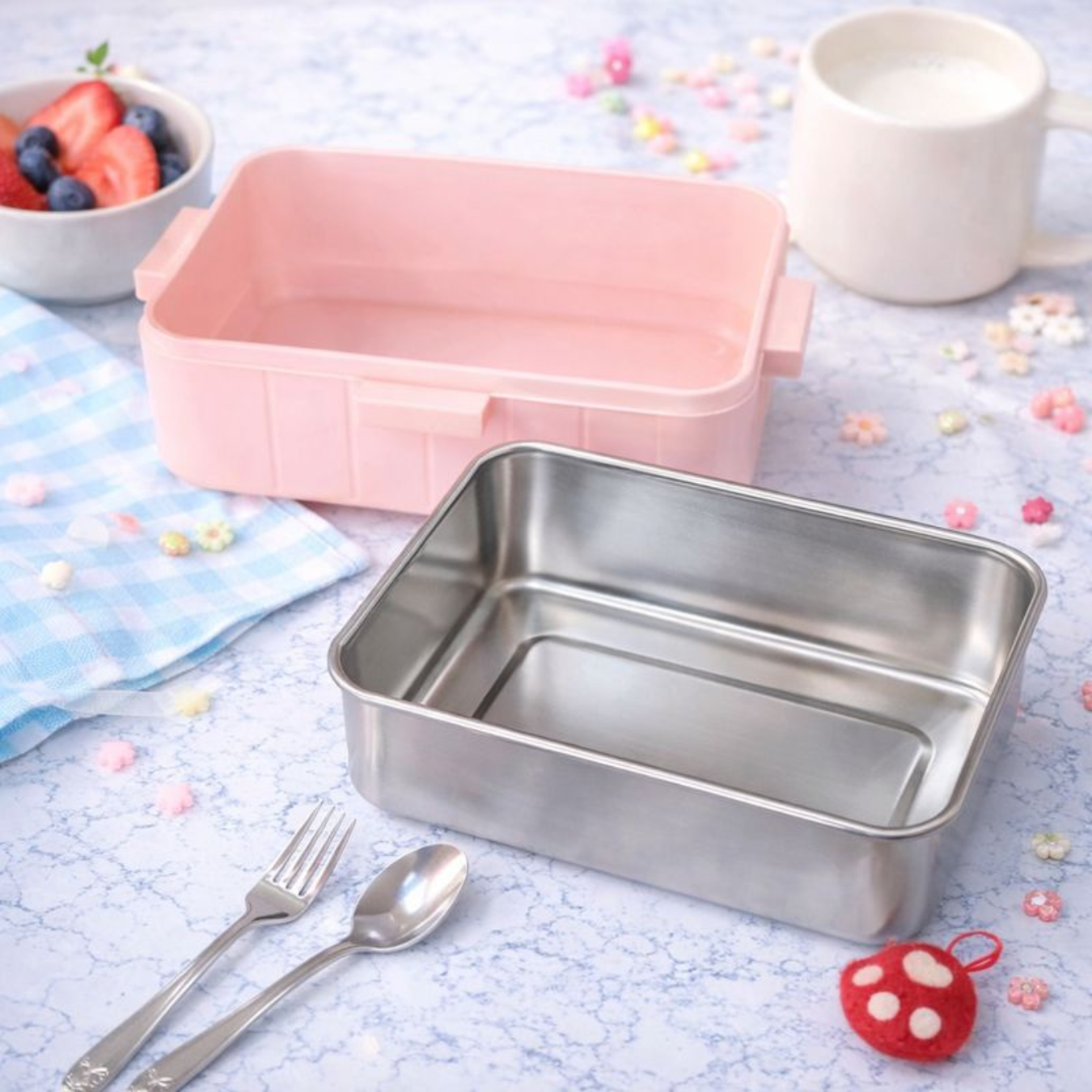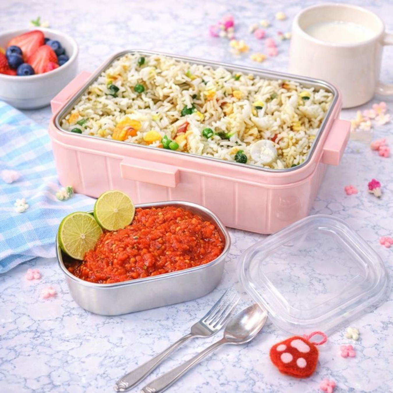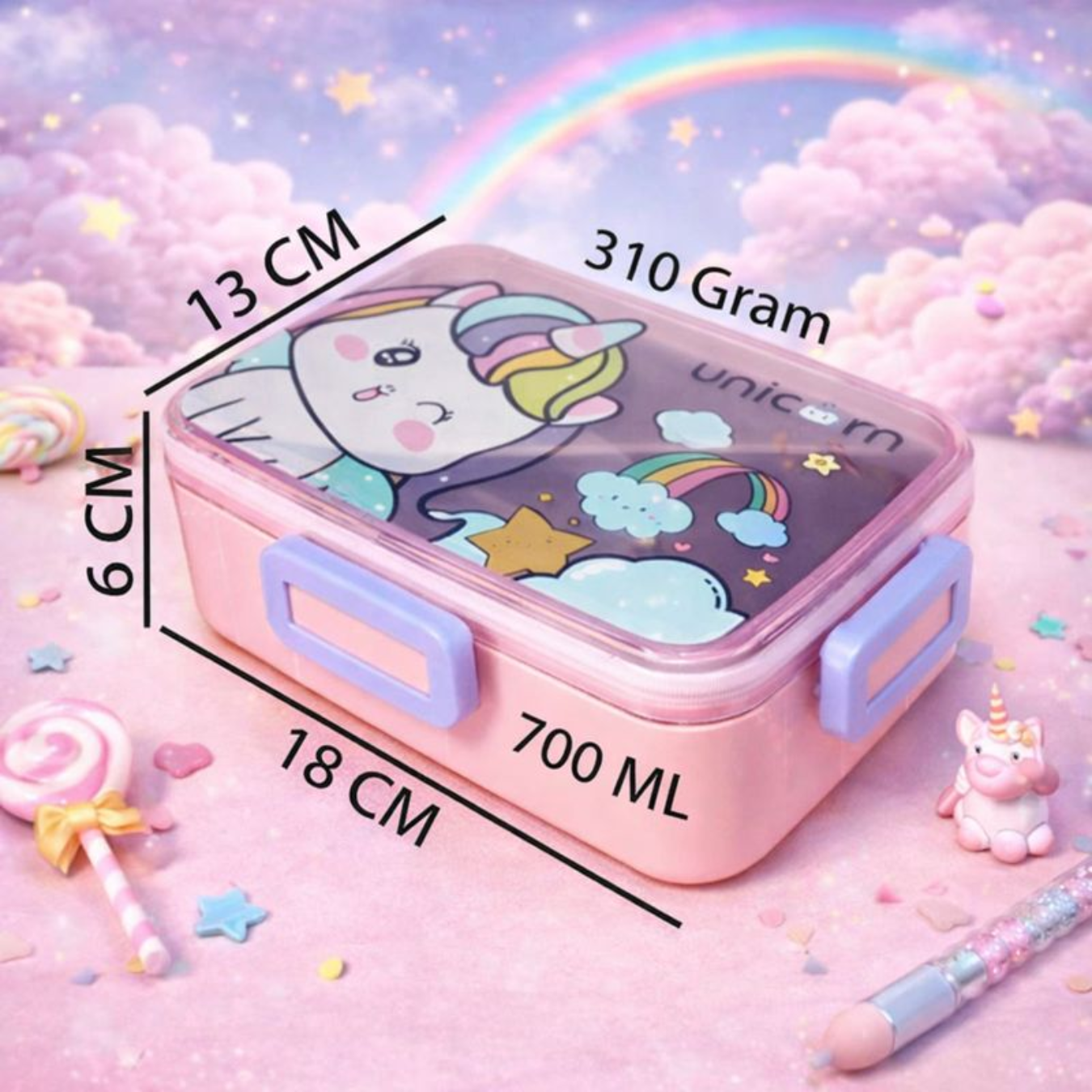 Kids premium stainless steel lunch box with a fun cartoon design and pink finish. Features a leak-proof 4-clip lock, separate dip container, lightweight build, and BPA-free safety—perfect for school, travel, and picnics.